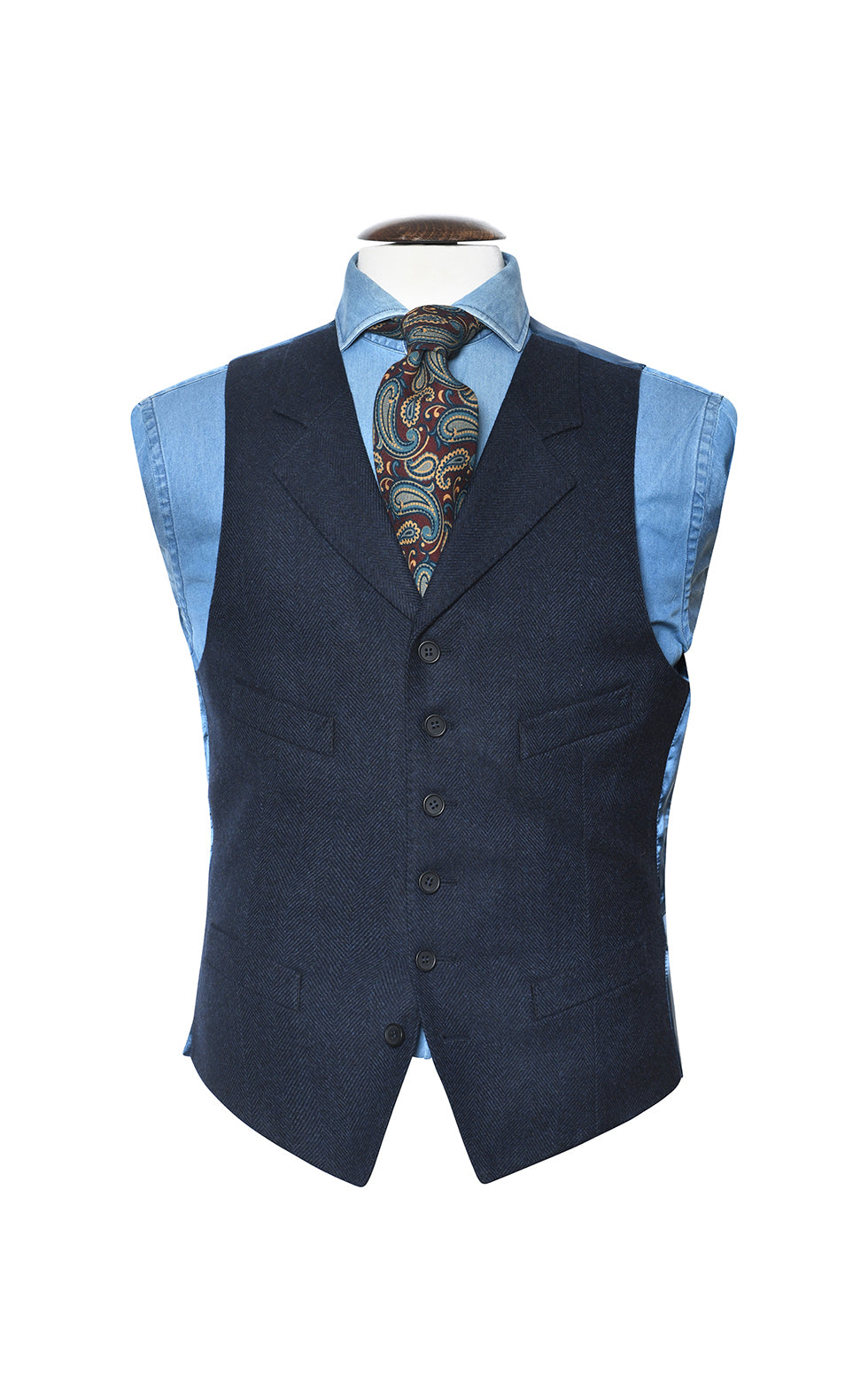 Option : Gilet droit à six boutons, quatre poches & revers de col.