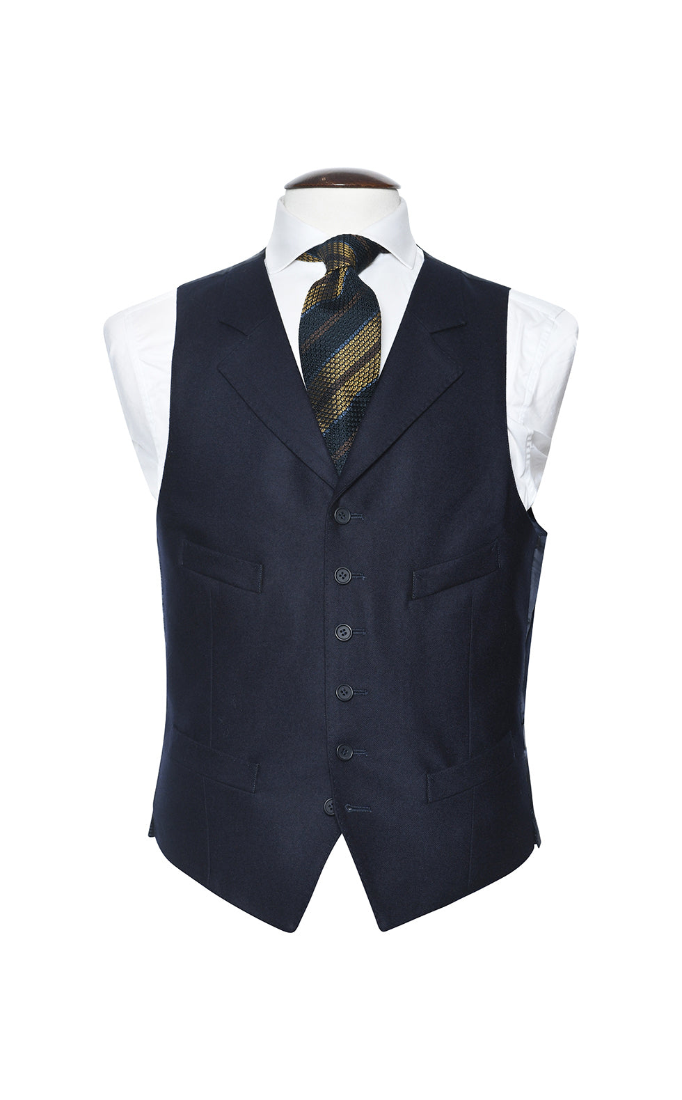 Option: Gilet droit à six boutons, quatre poches & revers de col.